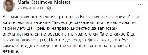 Блогърката Мария Касимова-Моасе, която е кандидат за вицепрезидент на Лозан Панов, не е пребивавала в България поне 226 дни за първите 10 месеца на минлата година. Това разкрива читател на агенция ПИК в сигнал до медията, в който са прикачени постове на Моасе в профила й във Фейсбук, от които става ясно кога точно е била в чужбина и кога се е прибирала в България.
