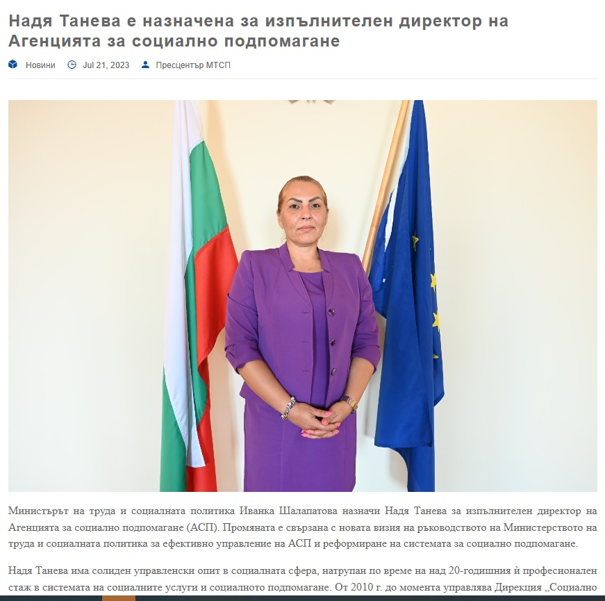 Преди две седмици Шалаптова назначи за изпълнителен директор на агенция "Социално подпомагане" кадър на ГЕРБ. Става дума за Надя Танева, дългогодишен директор на агенцията в Пловдив и бивш кандидат-депутат от партията на Борисов.