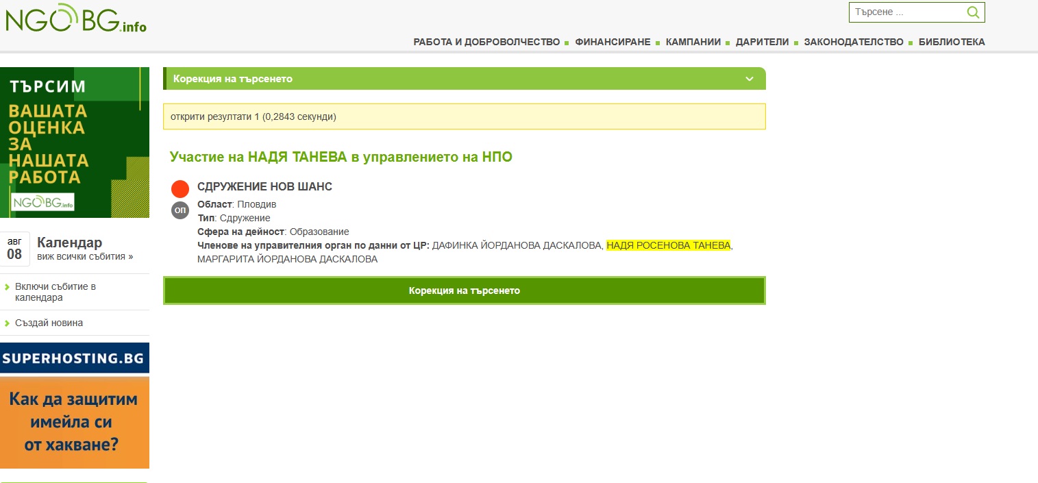Сега около Танева има нов казус, свързан с неправителствена организация, в която тя е член на Управителния съвет. Става дума за сдружението "Нов шанс", оглавявано от Дафинка Даскалова. Справка в интернет показва, че Танева също е сред членовете на управителния съвет на НПО-то, което е основано през 2012 г. и продължава да развива дейност.