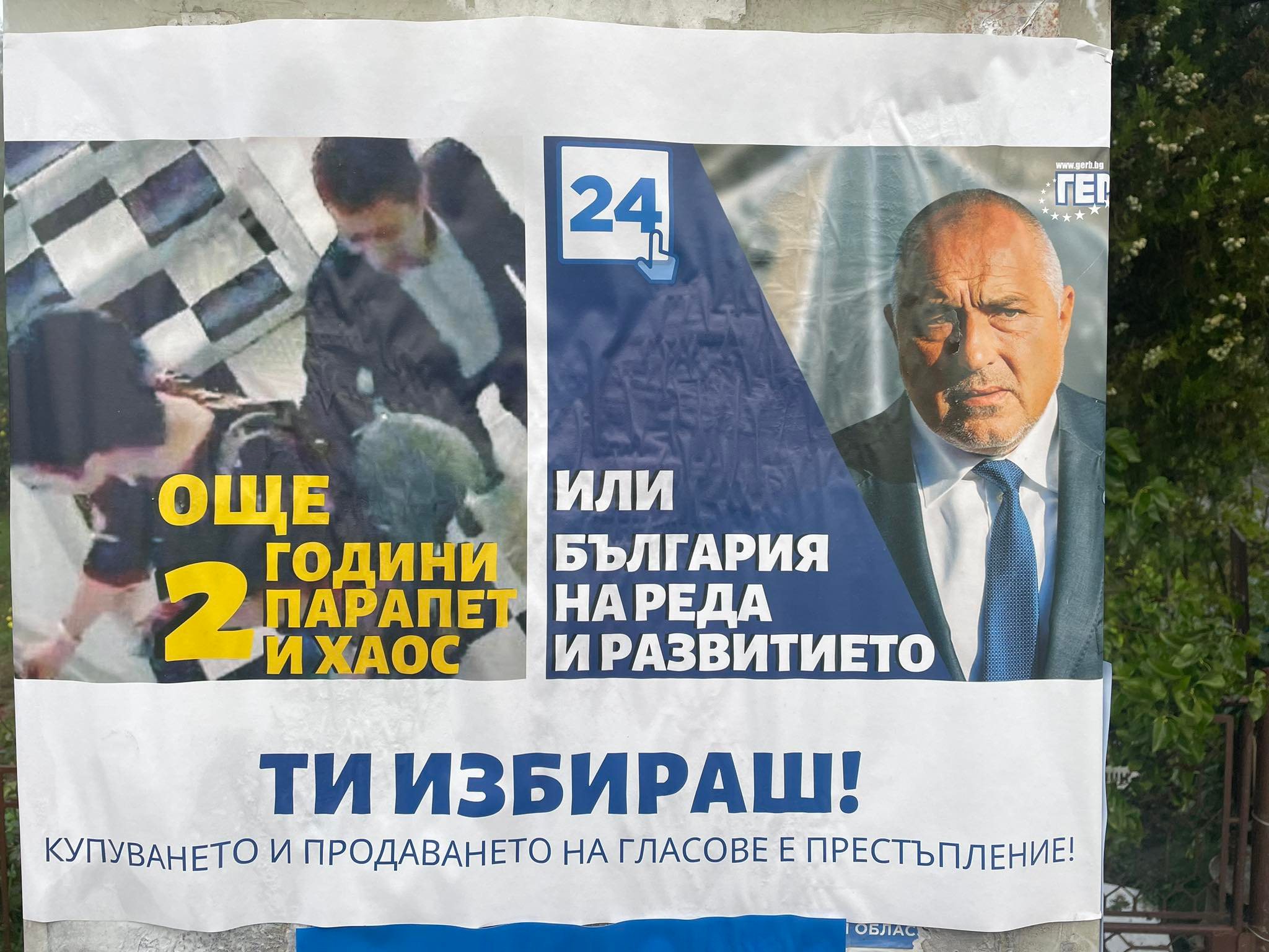 Агитационните материали правят съпоставка между правителството на Кирил Петков и управлението на Бойко Борисов. В тях са побрани и две снимки. Първата е кадърът от стълбището пред любовната квартира на Кирил Петков и Лена Бориславова. Запечатан е моментът от видеото на агенция ПИК, в което бившият премиер бърка под полата на шефката на кабинета си.