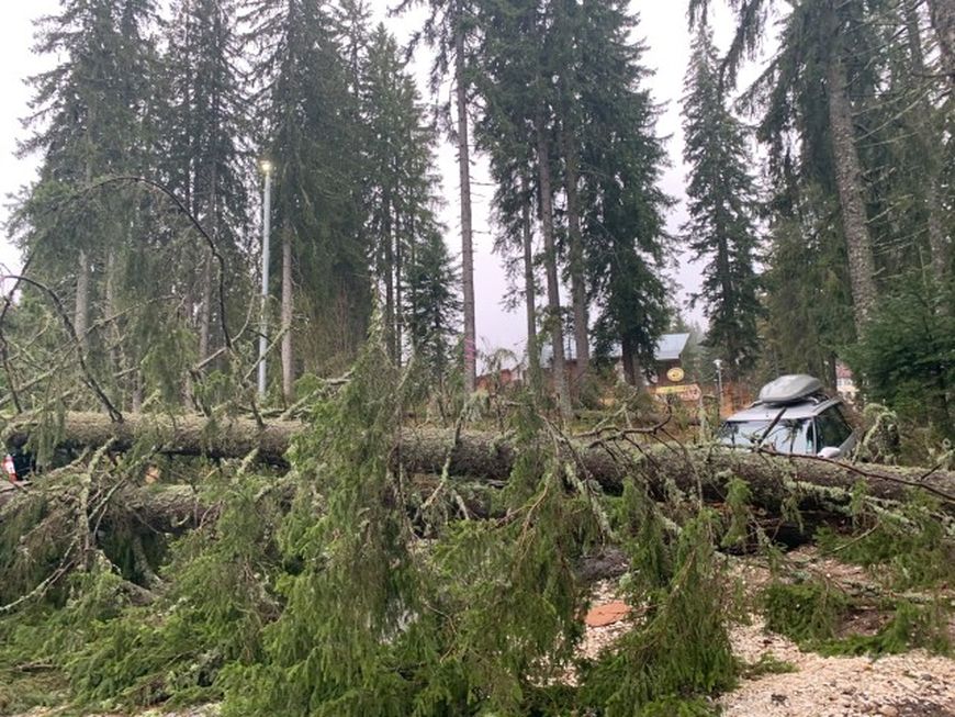 Силен вятър се изви тази сутрин в Пампорово. Той е съборил дървета в близост до посещаван хотел, предава Би Ти Ви.