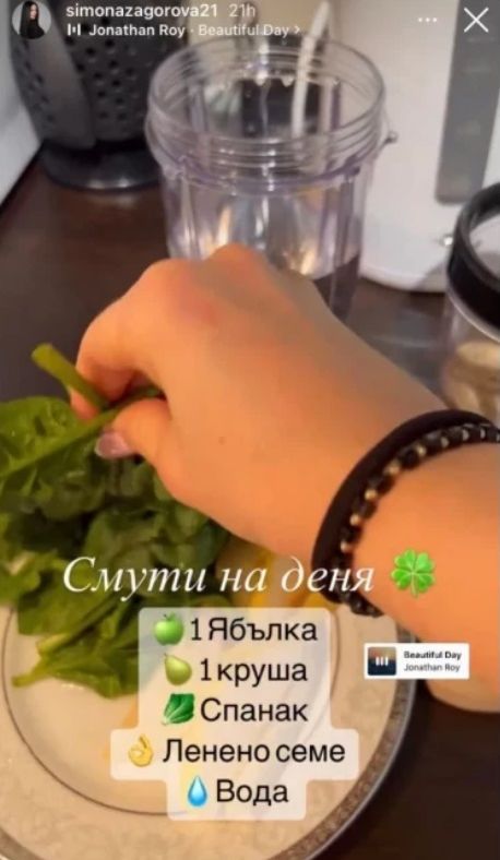 Любопитното в случая, е че за него Симона използва толкова изчистени съставки, че дори не е включила някакъв вид мляко, а предпочита да приготвя смутито си с вода.