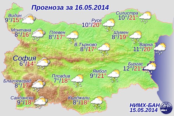 Отново на много места ще превалява дъжд, главно в часовете след обяд придружен от гръмотевици. Преобладаващите минимални температури ще бъдат между 5°-10°, максималните – между 15° и 20°. Атмосферното налягане ще се задържи по-ниско от средното за май.