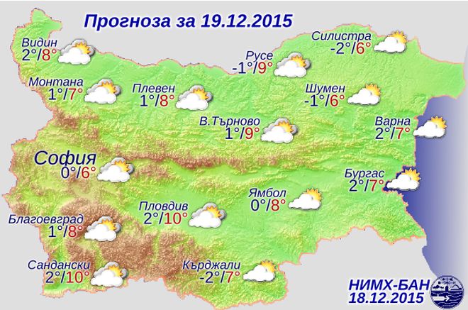 През нощта и утре до обяд на много места в равнините и котловините ще има ниска слоеста облачност или мъгла. След пладне облачността ще се разкъсва, а мъглата ще се разсейва, в планинските райони – до предимно слънчево време. Ще бъде почти тихо. Минималните температури ще са предимно между минус 3 и 2, а максималните - между 5° и 10°, по-ниски в районите с трайна мъгла.