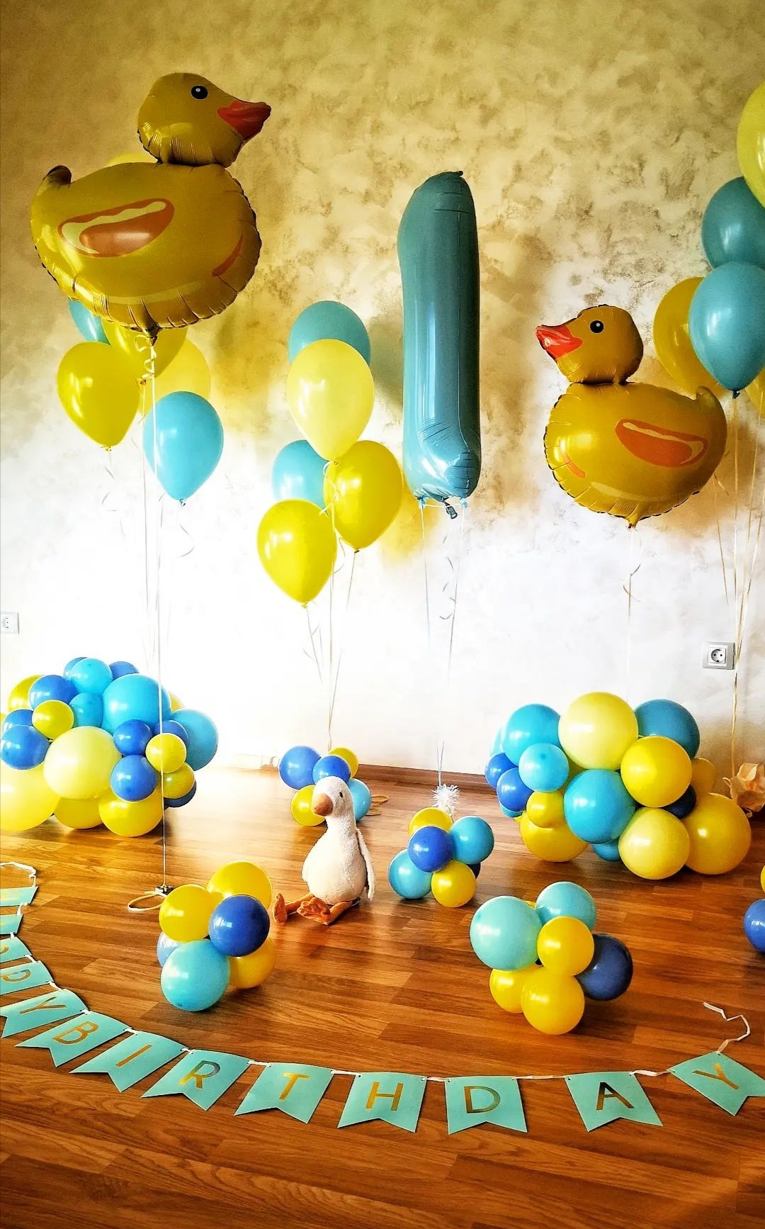 Щастливата майка издаде малко от празничната обстановка в дома им. Една от стаите е била украсен със сини и жълти балони, някои под формата на патенца.