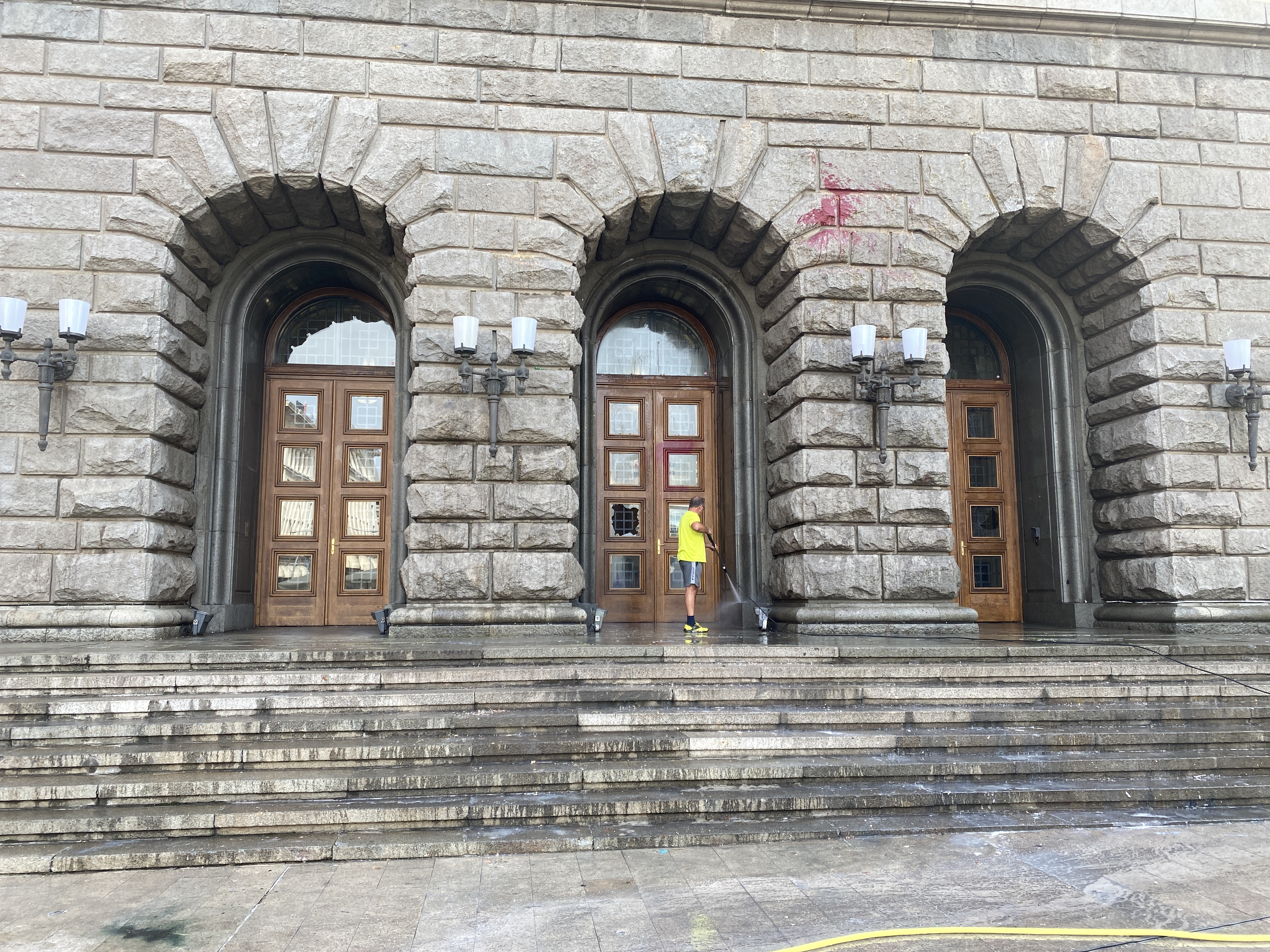 Изпотрошени са прозорците на Народното събрание ,съсипани са исторически павета и почистването продължава и към момента, тъй като центърът е превърнат от метежниците на Радев и Божков в кочина.