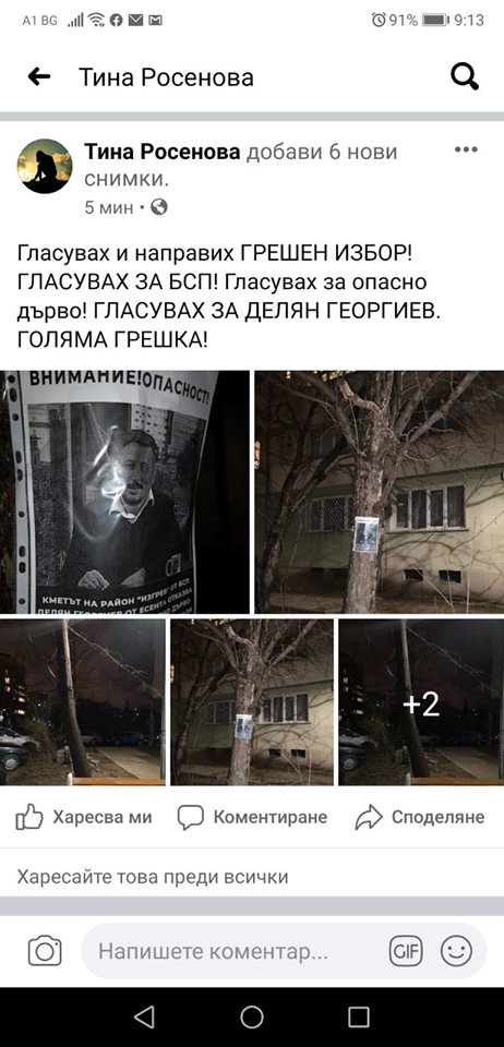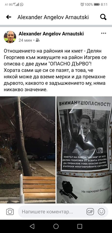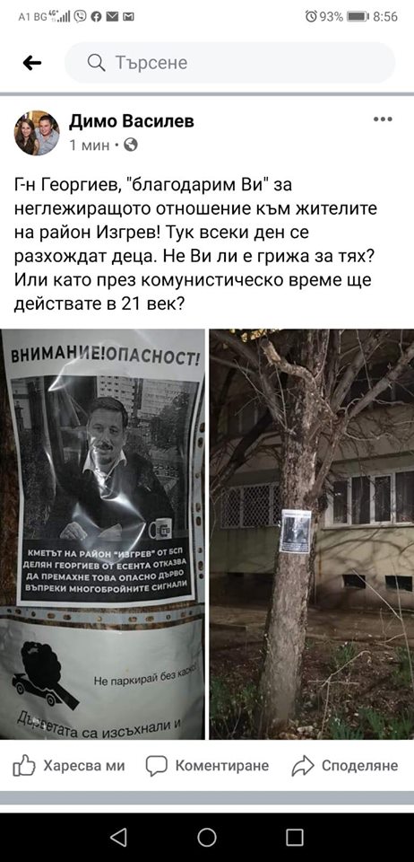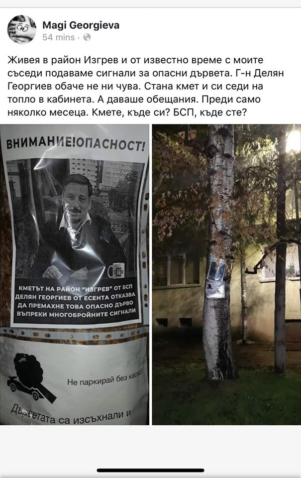 За да обърнат внимание на бездействащия кмет хората са облепили опасните дървета с портрети на Делян Георгиев и надпис : „Внимание! Опасност! Кметът на район „Изгрев“ от БСП Делян Георгиев отказва да премахне това опасно дърво, въпреки многобройните сигнали.