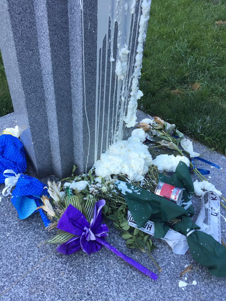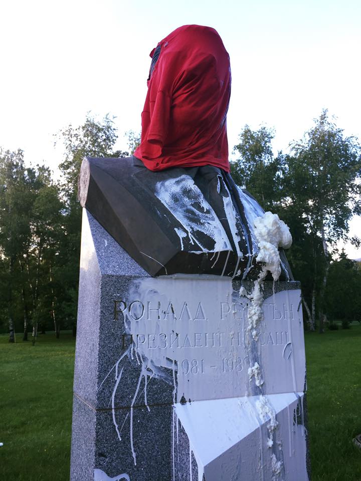 Вандали поругаха паметника на покойния американски президент Роналд Рейгън в София. Мемореалът осъмна омазан с бяла боя и с червена фланелка на главата.