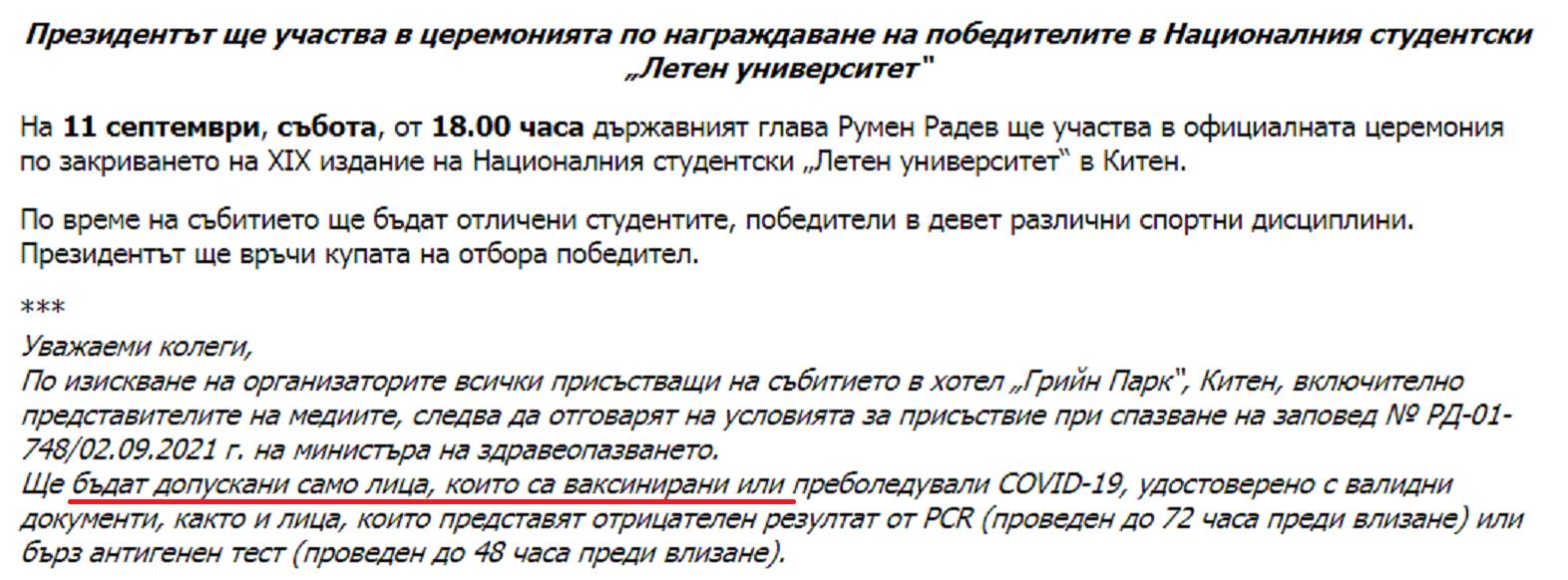 До събитието, на което се очаква да участват около 500 студенти, ще се допускат само ваксинирани, преболедували със съответните документи или с отрицателен ПСР тест, направен до 72 часа преди срещата.