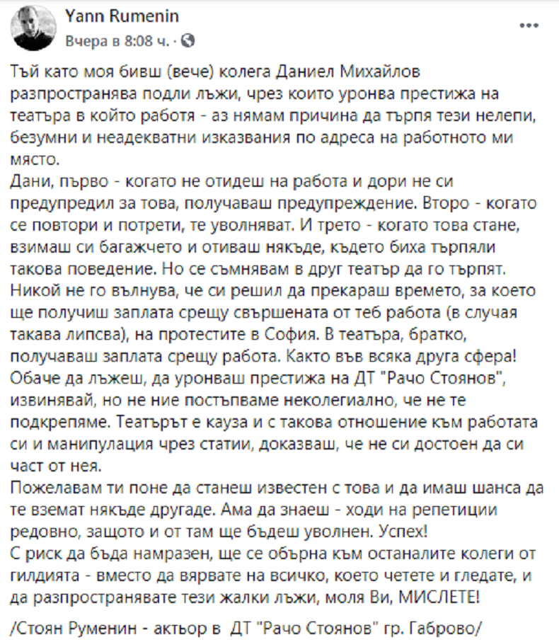 "Тъй като моя бивш (вече) колега Даниел Михайлов разпространява подли лъжи, чрез които уронва престижа на театъра в който работя - аз нямам причина да търпя тези нелепи, безумни и неадекватни изказвания по адреса на работното ми място.