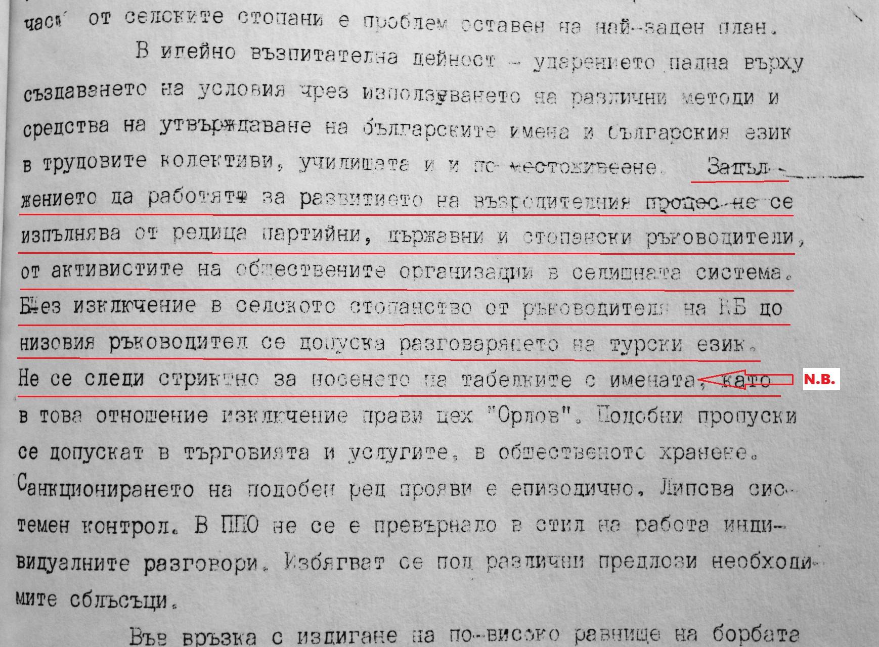 "Няма да повтарям. Съгласен съм с това да се даде незадоволителна оценка по възродителния процес на територията на селищната система. Да се работи със семействата поотделно, да се влезе по-близо до тях. Все още се шири говоренето на турски език и носенето на шалвари. Трябва да се проявява строг контрол".