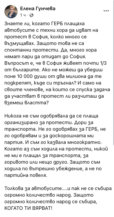 "Никога не съм одобрявала да се плаща организирано за протести. Дори за транспорта. Не го одобрявах за ГЕРБ, не го одобрявам и за доскорошната ми партия. И съм го казвала многократно. Когато аз съм ходила на протести, никой не ми е плащал за транспорта, за горивото или нещо друго. Защото съм ходила по вътрешно убеждение, а не по партийна повеля. Толкова за автобусите....и пак не се събира огромно количество народ. Защото огромно количество народ се събира, КОГАТО ТИ ВЯРВАТ!", пише още Елена Гунчева.