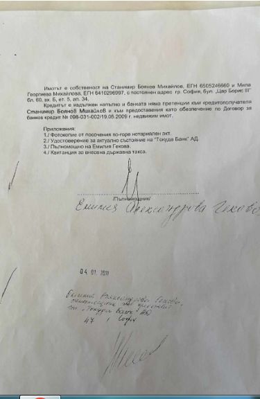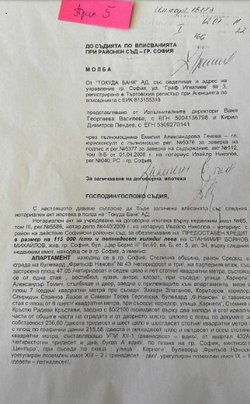 Месец по-късно го ипотекира (на 21.05.2009г.) пред банката, в която работи - "Токуда банк“ за 115 000 лева. Реално го ипотекира за сума в размер на близо 4 пъти по-голяма от покупната цена. (Виж прил.2)