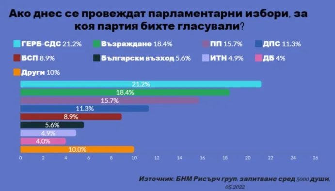 Споделян десетки пъти пост във Фейсбук съдържа резултати от предполагаемо допитване сред 5000 българи за електоралните им нагласи. Като източник на данните в „анкетата“ в публикуваната графика е посочен „БНМ Рисърч груп“. А датата е „05.2022“, съобщава БНР.