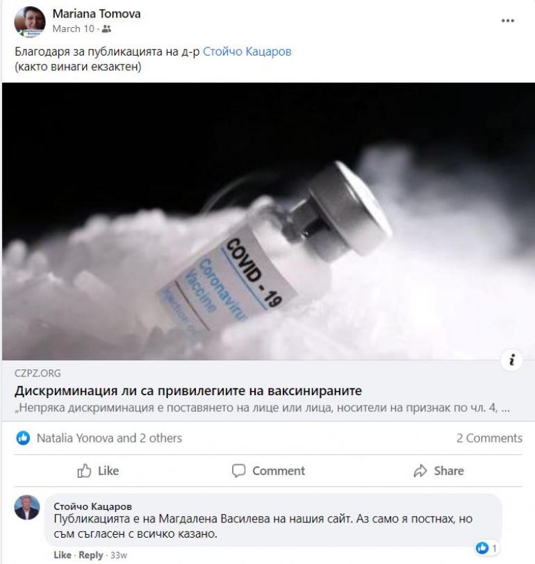 „В общия случай, определени рестрикции се прилагат при отказ от задължителна имунизация, ваксините срещу Ковид, обаче не са такива. Нещо повече, при ваксинирането с одобрените ваксини срещу коронавирус се подписва информирано съгласие, за това че сме запознати с ползите и рисковете. При „срещата“ на ваксинираните с неваксинираните има известно място за тълкуване дали законовата цел (справяне с пандемията) оправдава средствата (привилегиите)“, се пише в материала, който няма автор, но Кацаров признава, че е съгласен с всеки един написан ред.