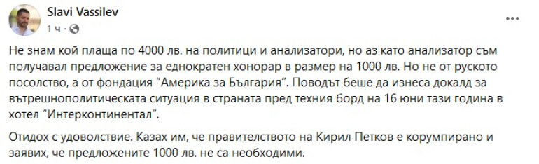 Не знам кой плаща по 4000 лв. на политици и анализатори, но аз като анализатор съм получавал предложение за еднократен хонорар в размер на 1000 лв. Но не от руското посолство, а от фондация “Америка за България”.