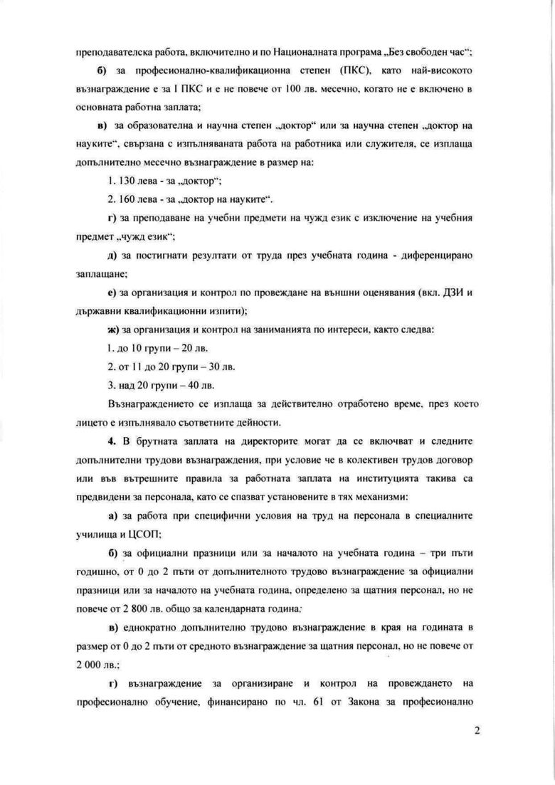 Най-високи са заплатите на директорите на учебни заведения с над 1400 ученици, като в тях възнагражденията са от 2420 до 2505 лева. Освен за директорите на училища, минимумът от 1535 лева трудово възнаграждение се отнася и за директорите на институции като центрове за специална образователна подкрепа, за подкрепа на личностното развитие, регионалните центрове за подкрепа на процеса на приобщаващото образование и други.