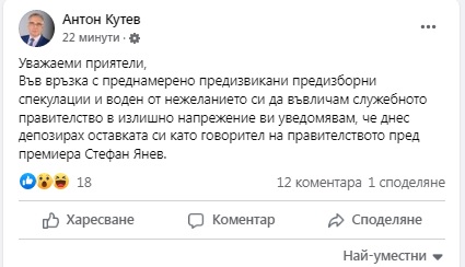 „Във връзка с преднамерено предизвикани предизборни спекулации и воден от нежеланието си да въвличам служебното правителство в излишно напрежение ви уведомявам, че днес депозирах оставката си като говорител на правителството пред премиера Стефан Янев“, написа Кутев.
