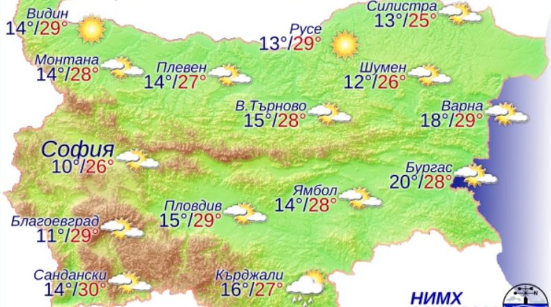 Над Черноморието ще бъде предимно слънчево. След обяд ще има временни увеличения на облачността, но ще е без валежи. Ще духа слаб до умерен вятър от запад-северозапад. Максималните температури ще са между 25 и 29 градуса. Температурата на морската вода се очаква да достигне 25 – 26 градуса. Вълнението на морето ще е около 1 - 2 бала.