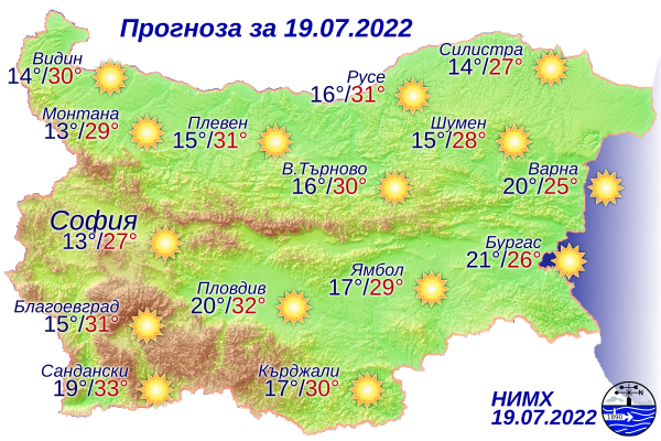 Ще бъде слънчево, след обяд над планинските райони ще се развива купеста облачност, но ще е почти без валежи. Ще духа слаб, в Източна България - умерен вятър от изток-североизток. Максималните температури ще са между 28° и 33°, в София - около 27°.