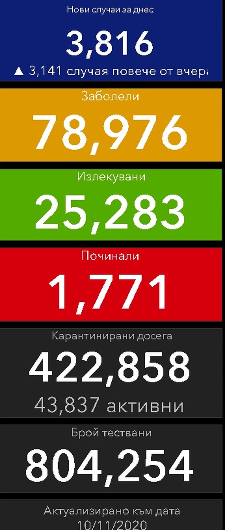 78 976 са вече положителните проби на заразени с коронавирус у нас. Това сочи справката на Единния информационен портал, обновен с данните от изследваните през вчерашния 9 ноември.