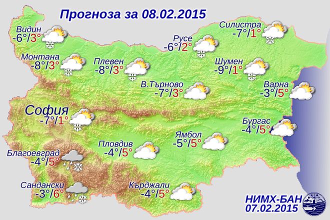 През нощта в събота срещу неделя облачността ще е променлива, в отделни райони - намаляваща до незначителна. Ще е почти тихо. Сутринта ще е студено, с минимални температури между минус 9° и минус 4°.Това сочи прогнозата на синоптиците от БАН за утре, 8 февруари.