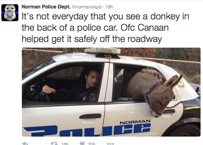 Снимка на магаре на задната седалка на полицейска кола стана истинска сензация в Twitter. Фотографията е публикувана в профила на полицейския участък на американския град Норман, щата Оклахома, и е придружена с надпис „Не всеки ден виждаш магаре на задната седалка на полицейска кола".