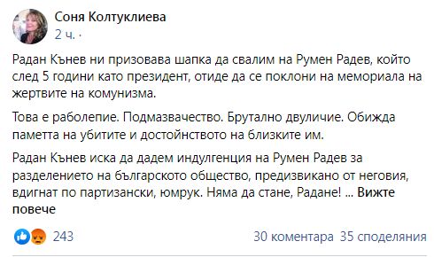 Това е раболепие. Подмазвачество. Брутално двуличие. Обижда паметта на убитите и достойнството на близките им." Това пише в профила си във "Фейсбук" журналистката Соня Колтуклиева. Поводът е благодарността,с която евродепутатът се обръна към президента по повод новината, че държавният глава отдаде почит пред паметта на жертвите на комунистическия режим.