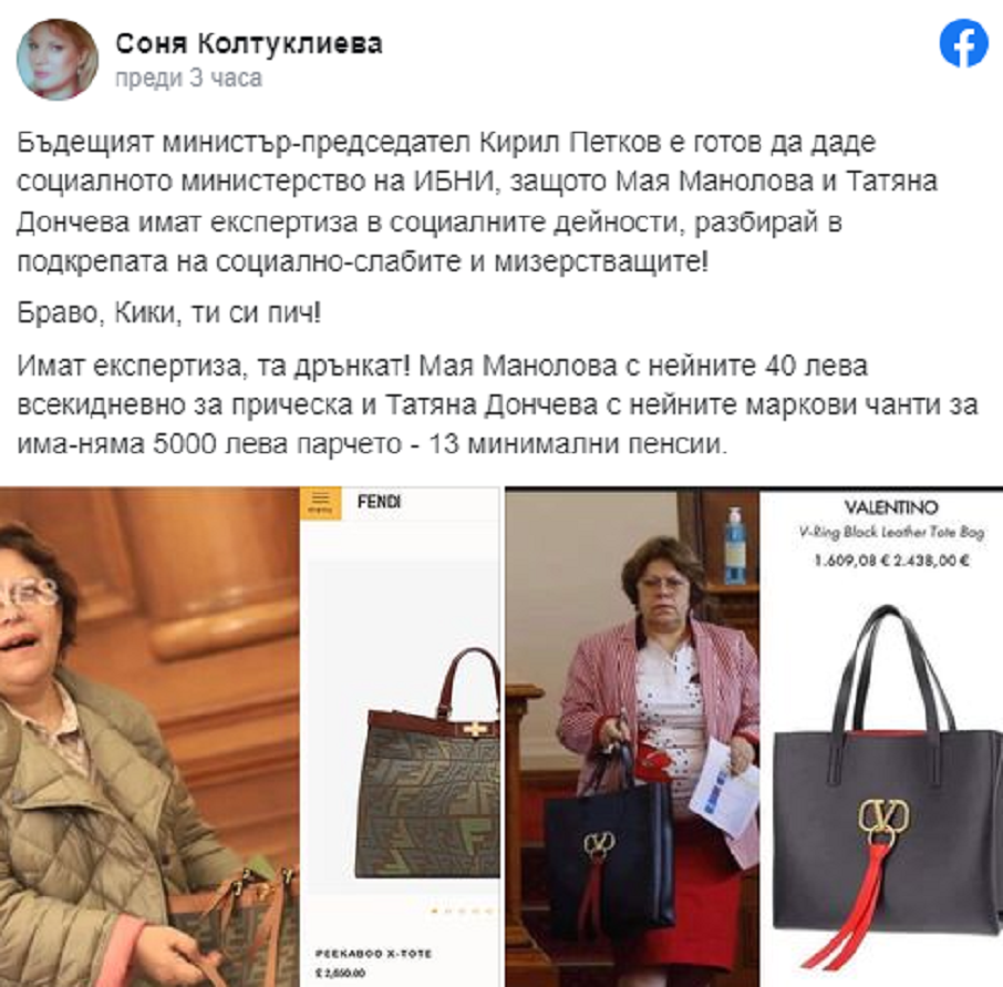“Имат експертиза, та дрънкат! Мая Манолова с нейните 40 лева за всекидневен сешоар и Татяна Дончева с нейните маркови чанти за има-няма 5000 лева парчето“, пише още Колтуклиева.