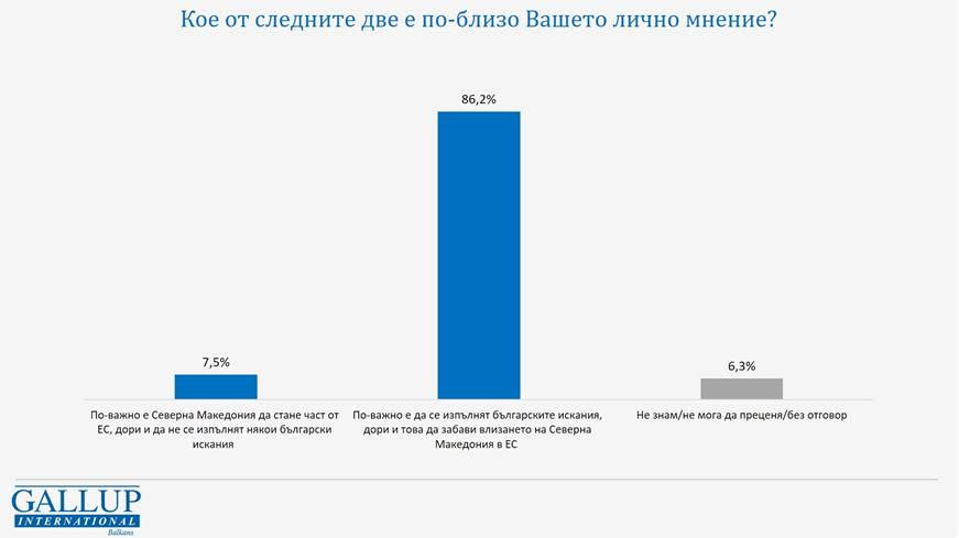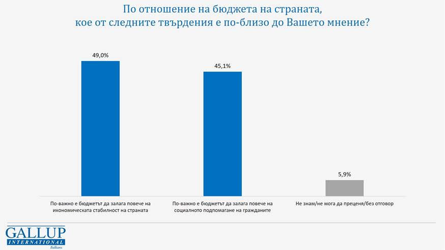 В същото време обаче на въпрос какъв да е приоритетът на бюджета, като че ли не се забелязва очакванията силно изразен социален инстинкт за сметка на всичко друго. 45,1% са привлечени от социални акценти в бюджета, но дори повече – 49,0% – по-скоро споделят идеята за финансовата стабилност на страната като приоритет. Двете мнения не си противоречат, но експериментът с противопоставянето им показва какъв приоритет дават българите. По отношение на въпроса за Северна Македония обаче в България явно няма две мнения – в тази тема трудно се припознава каквато и да била идея, че европейският път на Скопие може да е решение на двустранните ни спорове. Очаква се преди всичко решаване на споровете, преди Скопие да получи европейски път.