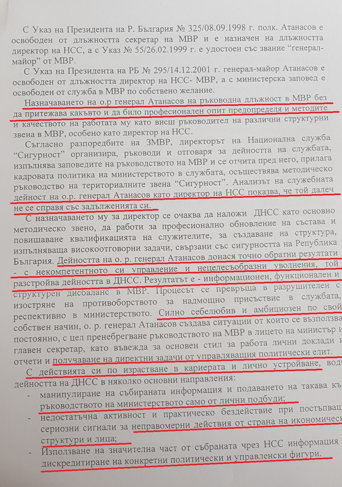 От характеристиката става ясно, че анализът на служебната дейност на Атанасов като директор на НСС показва, че той далеч не се справя със задълженията си. С назначаването му за директор се очаква да наложи ДНСС, като основно методическо звено, да работи за професионално обновление на състава и повишаване квалификацията на служителите, за създаване на структура, изпълняваща високоотговорни задачи, свързани със сигурността на Република България.
