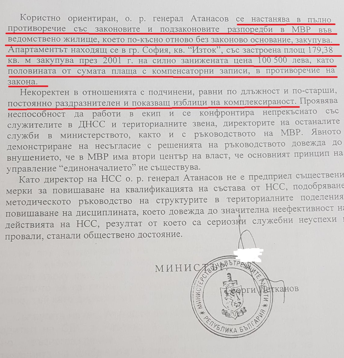 Въпросната характеристика се базира на данни и факти събирани през годините от негови колегив МВР и страховити разкрития за близките отношения на Атанасов с олигарси и силови групировки, не без вещата подкрепа на неговата тогавашна съпруга Анелия Атанасова.