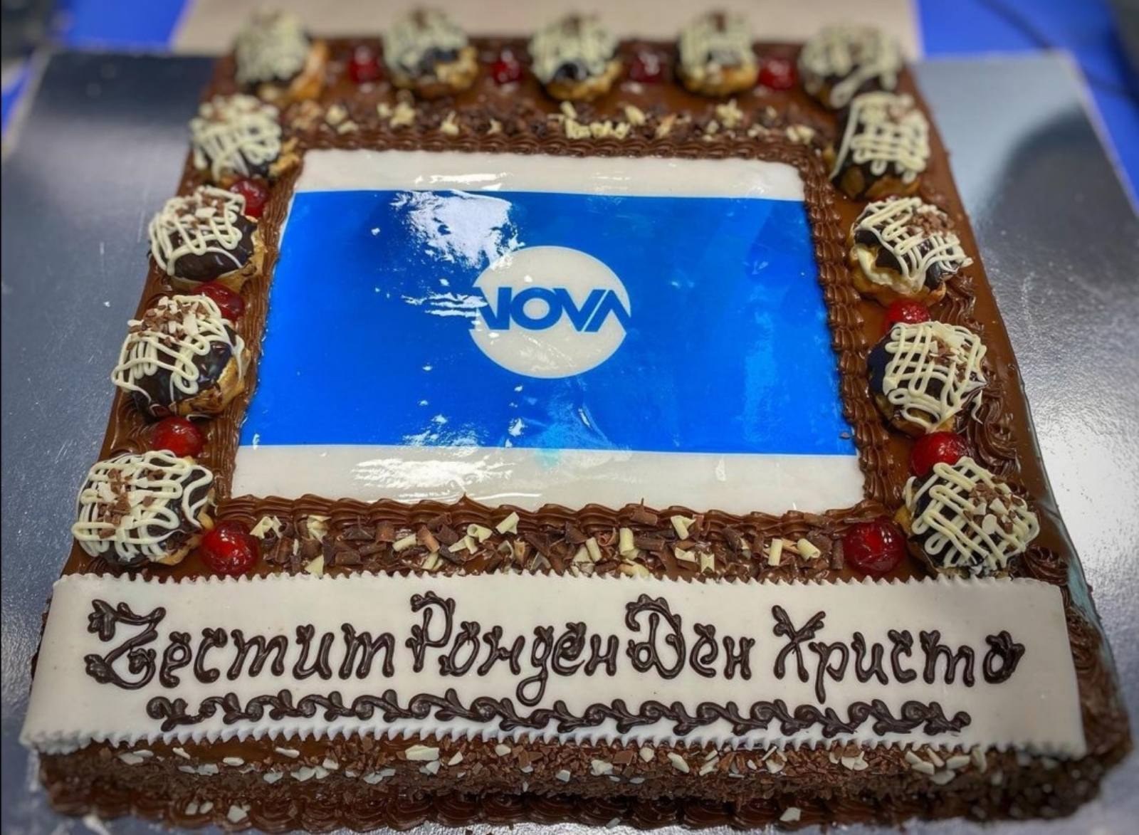 Сладкарското произведение е от шоколад, мини еклери и с логото на Нова телевизия, в която Калоферов работи вече 12 години.