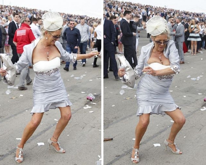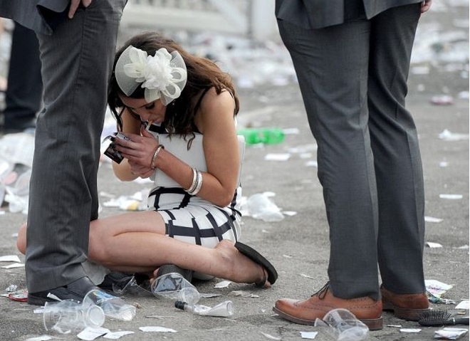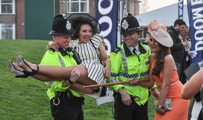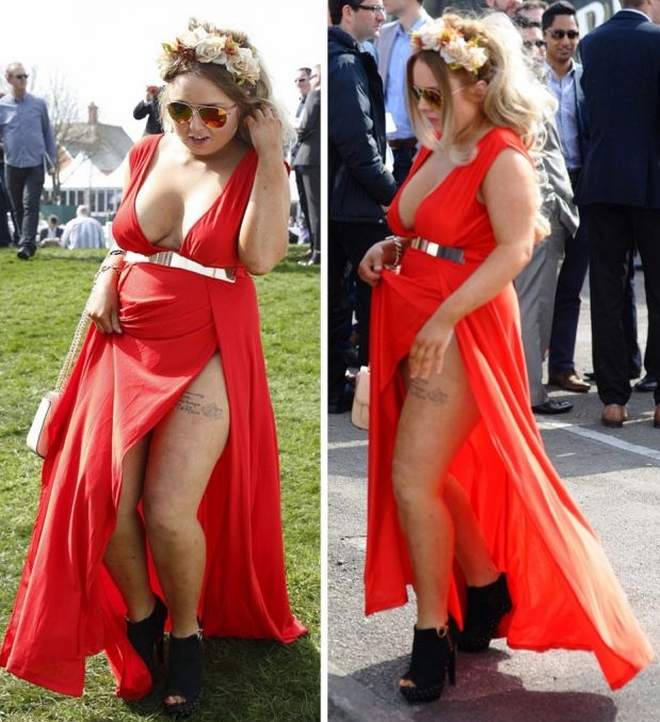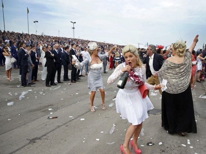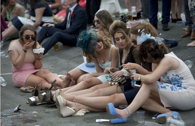 Тази година времето не беше идеално за празненства на открито, но това не стресна накипрените британки. Полюбувайте им се! Какви жени?! Никакви комплекси! Душички! Да краката се огъват от погълнатото несметно количество мартини с бира. Да, трудно е да се ходи в подобно състояние на високи токчета. Затова са и насядали направо на земята. Но вижте ги колко са непосредствени и жизнерадостни, отбелязва Daily Mail.