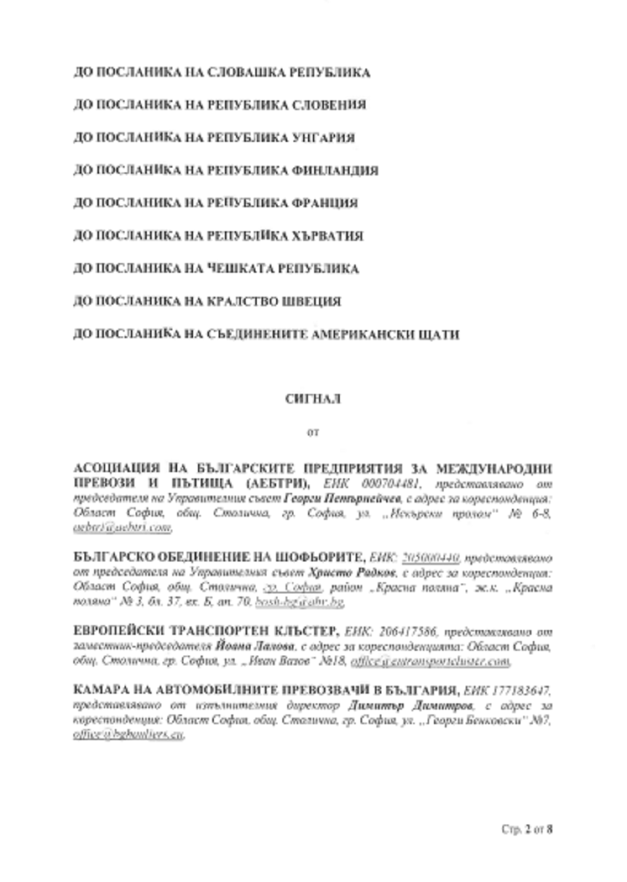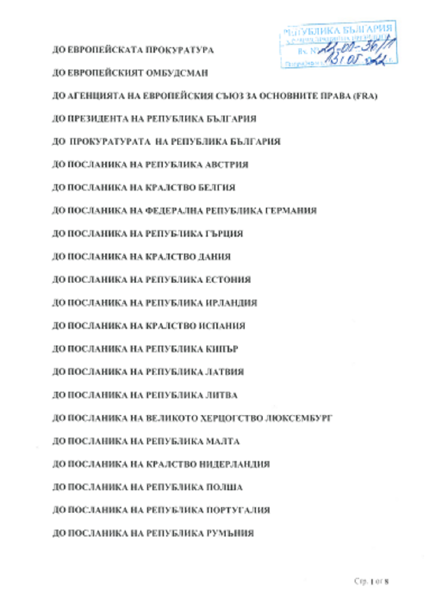 Копие от сигнала е разпратен и до всички посланици на страните-членки на ЕС у нас, както и до европейския омбудсман.