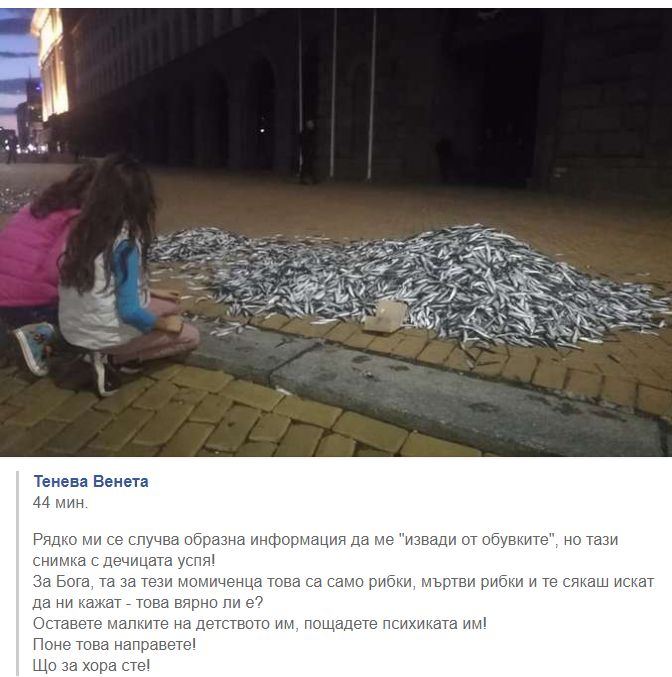 „Рядко ми се случва образна информация да ме "извади от обувките", но тази снимка с дечицата успя!“ Това написа в личния си профил будна и бдителна гражданка на София. Тя публикува и сърцераздирателна снимка към коментара си. Венета Тенева изригна след снощната ужасяваща и гнусна акция на метежниците начело с Арман Бабикян, адвокат Николай Хаджигенов и Велислав Минеков. Организаторите на протестите срещу легитимно избраното правителство изсипаха 300 кг риба пред Министерски съвет.