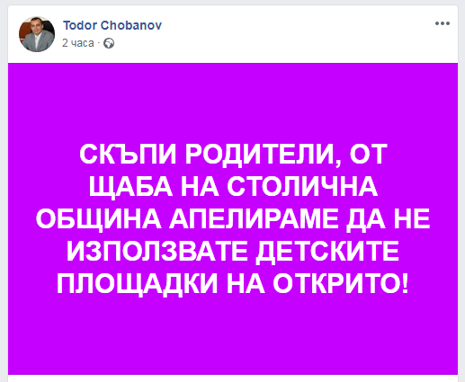 Родителите в София да спрат да разхождат децата по улиците и най-вече - да не ги водят да играят на детската площадка. Такъв апел отправи заместник-кметът на Столична община Тодор Чобанов от името на столичния кризисен щаб.