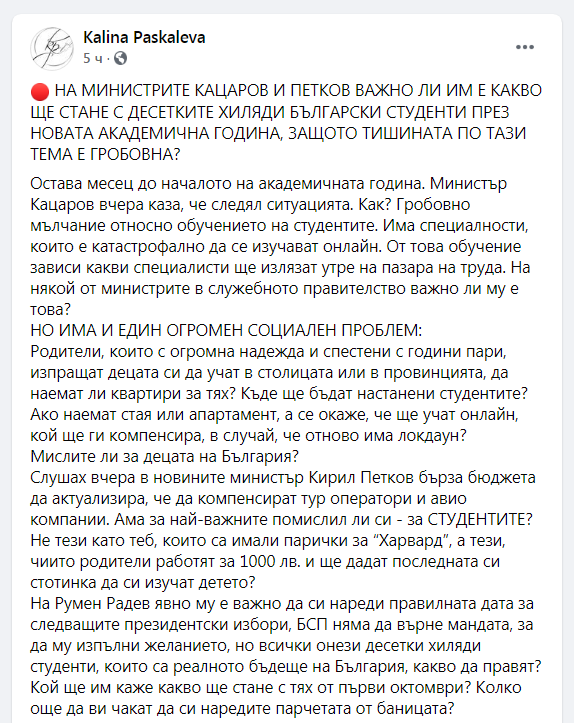 Остава месец до началото на академичната година. Министър Кацаров вчера каза, че следял ситуацията. Как? Гробовно мълчание относно обучението на студентите. Има специалности, които е катастрофално да се изучават онлайн. От това обучение зависи какви специалисти ще излязат утре на пазара на труда. На някой от министрите в служебното правителство важно ли му е това?