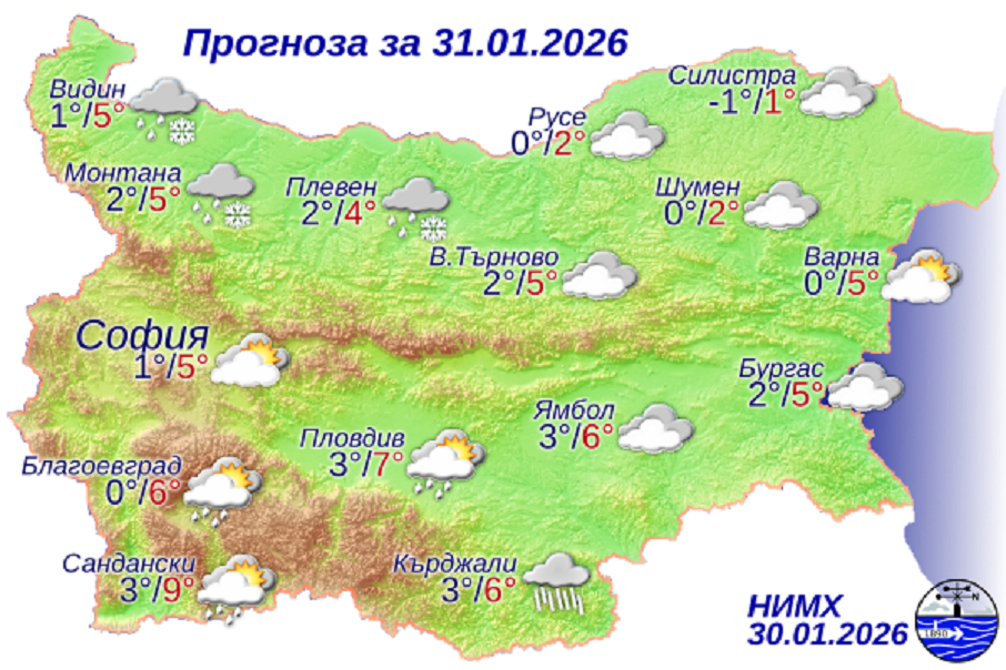 Максималните температури през деня ще са между 2° и 7°, в София – около 5°.