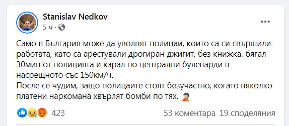 Само в България може да уволнят полицаи, които са си свършили работата, като са арестували дрогиран джигит, без книжка, бягал 30мин от полицията и карал по централни булеварди в насрещното със 150км/ч.