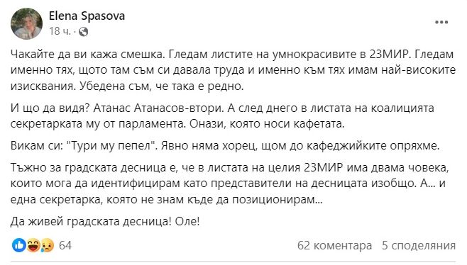 Тъжно за градската десница е, че в листата на целия 23 МИР има двама човека, които мога да идентифицирам като представители на десницата изобщо. А... и една секретарка, която не знам къде да позиционирам... Да живей градската десница! Оле!", написа Спасова (на колажа - долу в дясно, б.р.).
