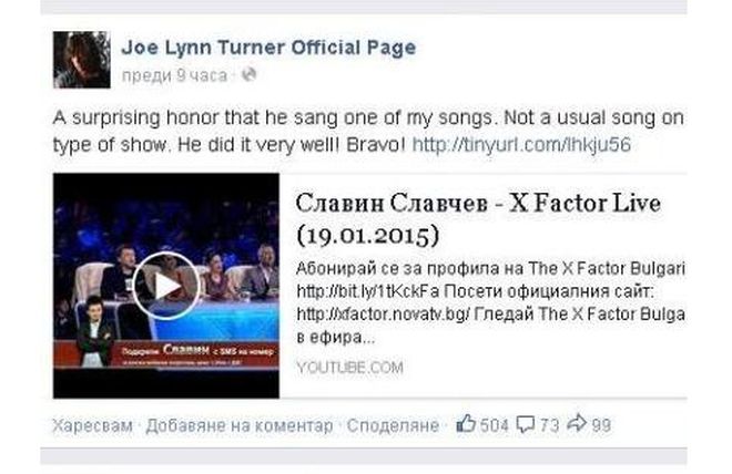 Световно признание в "Х фактор" – легендарният вокал на Rainbow и Deep Purple Джо Лин Търнър изрази възхищението си пред Славин и изпълнението му на една от култовите песни на Rainbow – Can’t let you go.