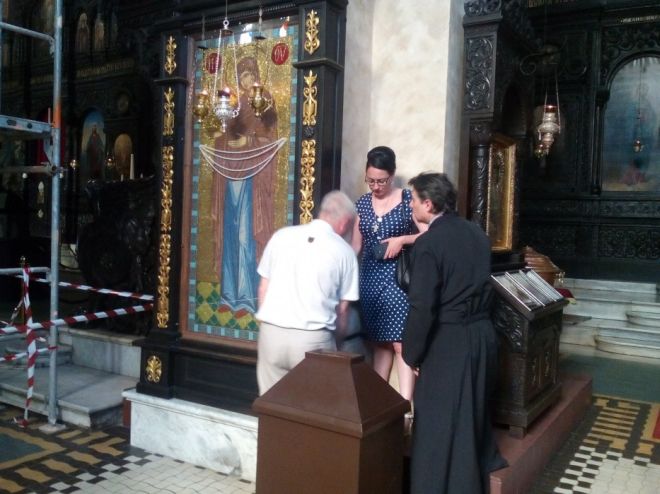 Сватбата е пред страничен олтар до главния вход, от който изнасят иконите за шествия. Причината е, че вътре тече реставрация на стенописите и под купола има скеле.