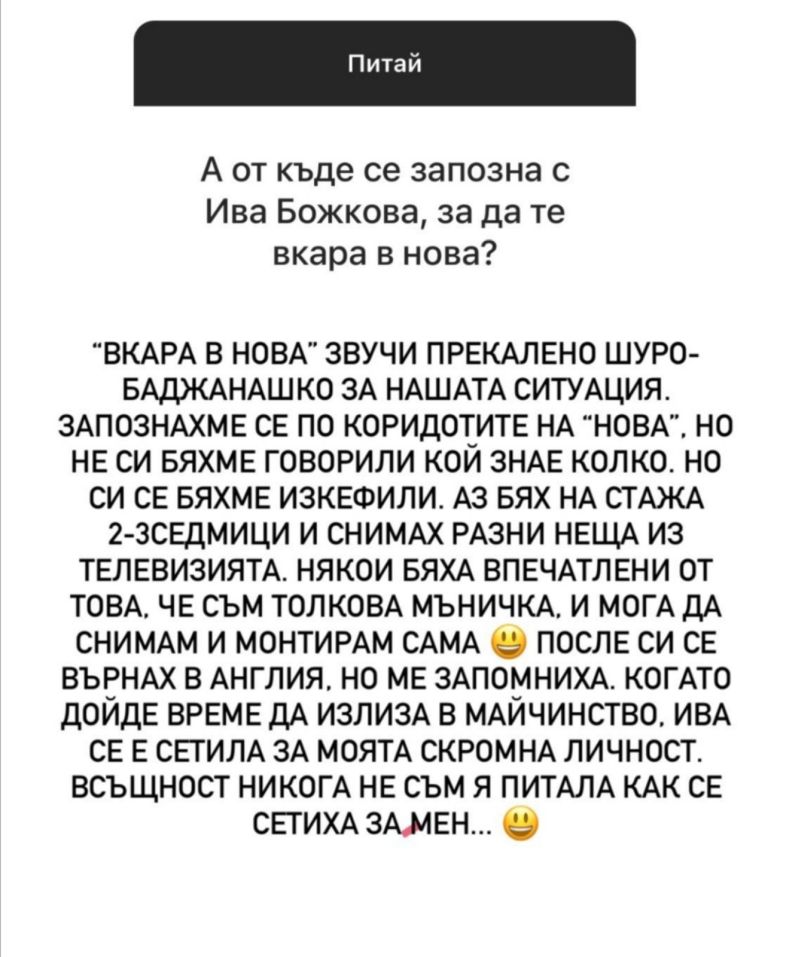 Със Софиянска се запознали из коридорите на Нова телевизия. "Не си бяхме говорили кой знае колко. Но си се бяхме изкефили. Аз бях на стаж 2-3 седмици и снимах разни неща из телевизията. Някои бяха впечатлени от това, че съм толкова мъничка, а мога да снимам и монтирам сама. После си се върнах в Англия, но ме запомних. Когато дойде време да излиза в майчинство, Ива се е сетила за моята скромна личност. Всъщност никога не съм я питала как се сетиха за мен...", разказа Банда надълго и нашироко как се е озовала в телевизията.