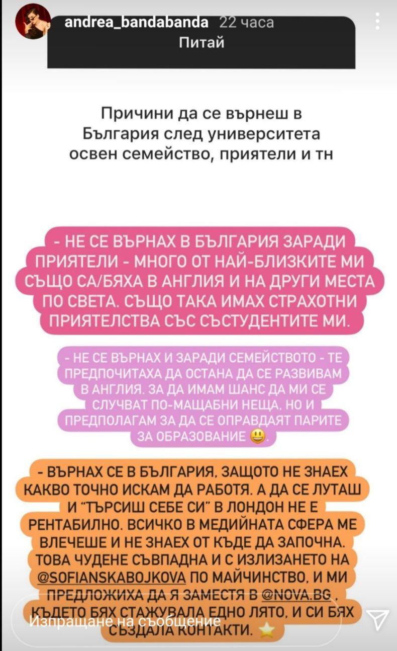 Това се разбра от признанията на панелистката в "На кафе" Андреа Влъчкова, известна повече като Андреа Банда Банда. В Инстаграм тя бе запитана каква е причината да се върне в България след завършването на образованието си в чужбина. Андреа загърбила живота и приятелите си в Лондон, защото я влечала медийната среда. И докато се чудила с какво да се захване, Ива Софиянска се приготвяла да излиза в майчинство...