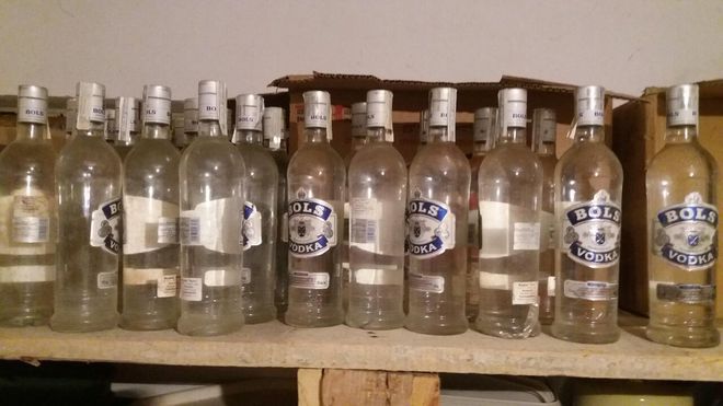 В същото помещение са открити и бутилки уиски и водка, общо 30 на брой, с алкохол без акцизен бандерол, както и други 54 бутилки водка, облепени с бандероли с изтекъл срок на валидност.