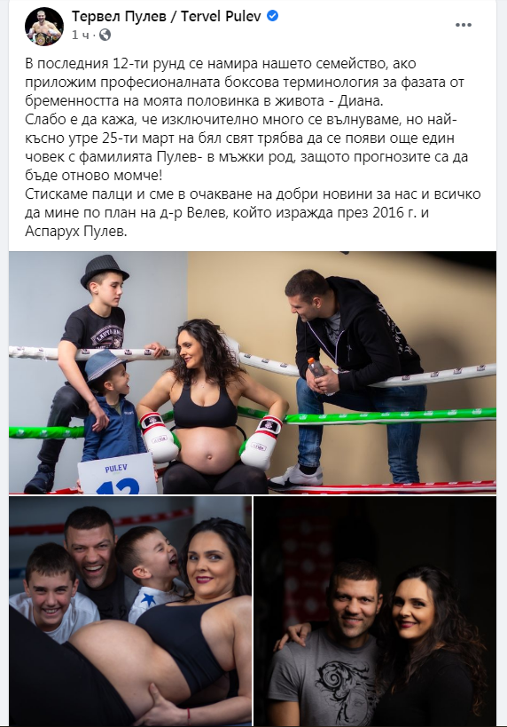 Ето какво написа Тервел Пулев: "В последния 12-ти рунд се намира нашето семейство, ако приложим професионалната боксова терминология за фазата от бременността на моята половинка в живота - Диана. Слабо е да кажа, че изключително много се вълнуваме, но най-късно утре 25-ти март на бял свят трябва да се появи още един човек с фамилията Пулев- в мъжки род, защото прогнозите са да бъде отново момче! Стискаме палци и сме в очакване на добри новини за нас и всичко да мине по план на д-р Велев, който изражда през 2016 г. и Аспарух Пулев.“