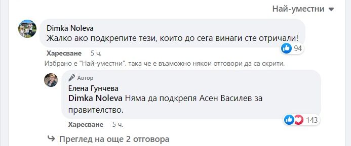 В късни следобед Гунчева отговори на коментар под своя публикация, който гласи: "Жалко, ако подкрепите тези, които досега винаги сте отричали".