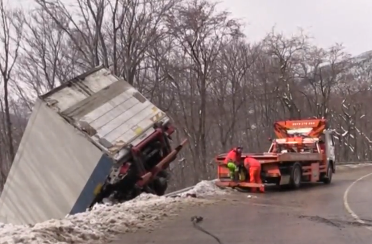Причината е, че тежкотоварен автомобил е излязъл от пътното платно и буквално е „увиснал“ над пропастта.