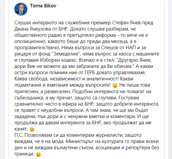 Слушах интервюто на служебния премиер Стефан Янев пред Диана Янкулова от БНР. Докато слушам разбирам, че общественото радио е претърпяло реформа - то вече не е опозиционно, каквото беше до преди два месеца, а е проправителствено. Няма въпроси за Спецов от НАП и за рицаря от фонд "Земеделие", няма въпрос за хаоса с машините и глупавия Изборен кодекс. Всичко е в стил: "Другарю Янев, дори Вие не можете да ми забраните да Ви обичам." Това коментира на страницата си във Фейсбук политологът, журналист и политик от ГЕРБ Тома Биков.